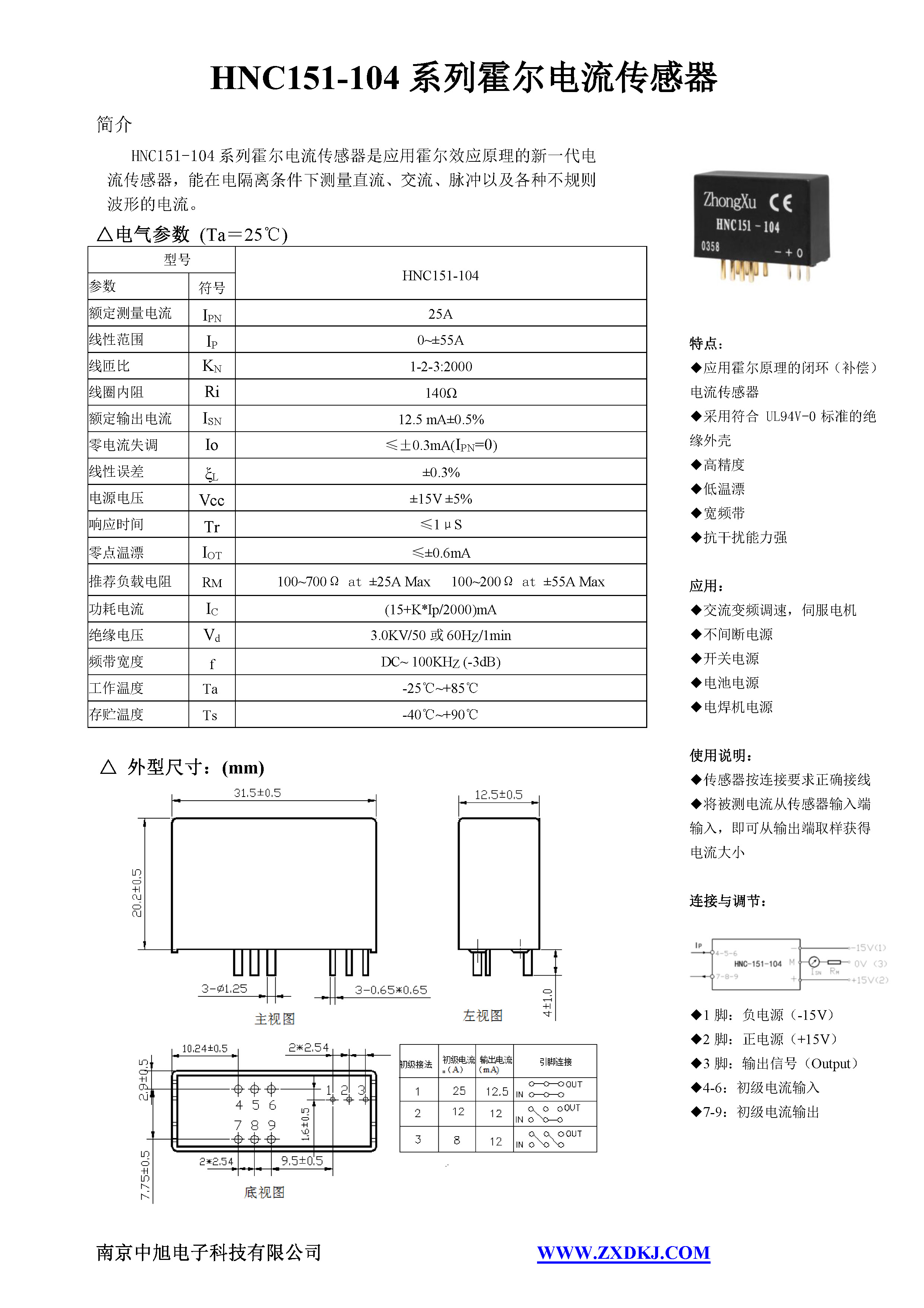 HNC151-104 series Hall current sensor is a new generation of current sensor using the principle of Hall effect. It can measure currents of DC, AC, pulse and various irregular waveform under electrical isolation.
