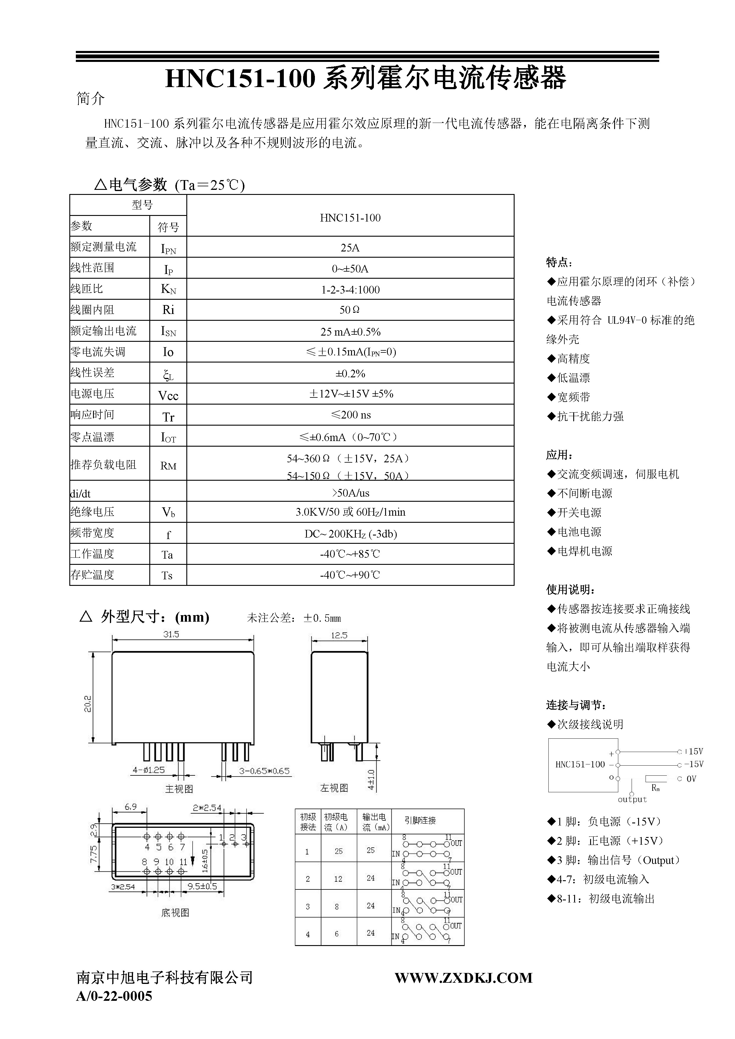 HNC151-100 series Hall current sensor is a new generation of current sensor using the principle of Hall effect. It can measure currents of DC, AC, pulse and various irregular waveform under electrical isolation.