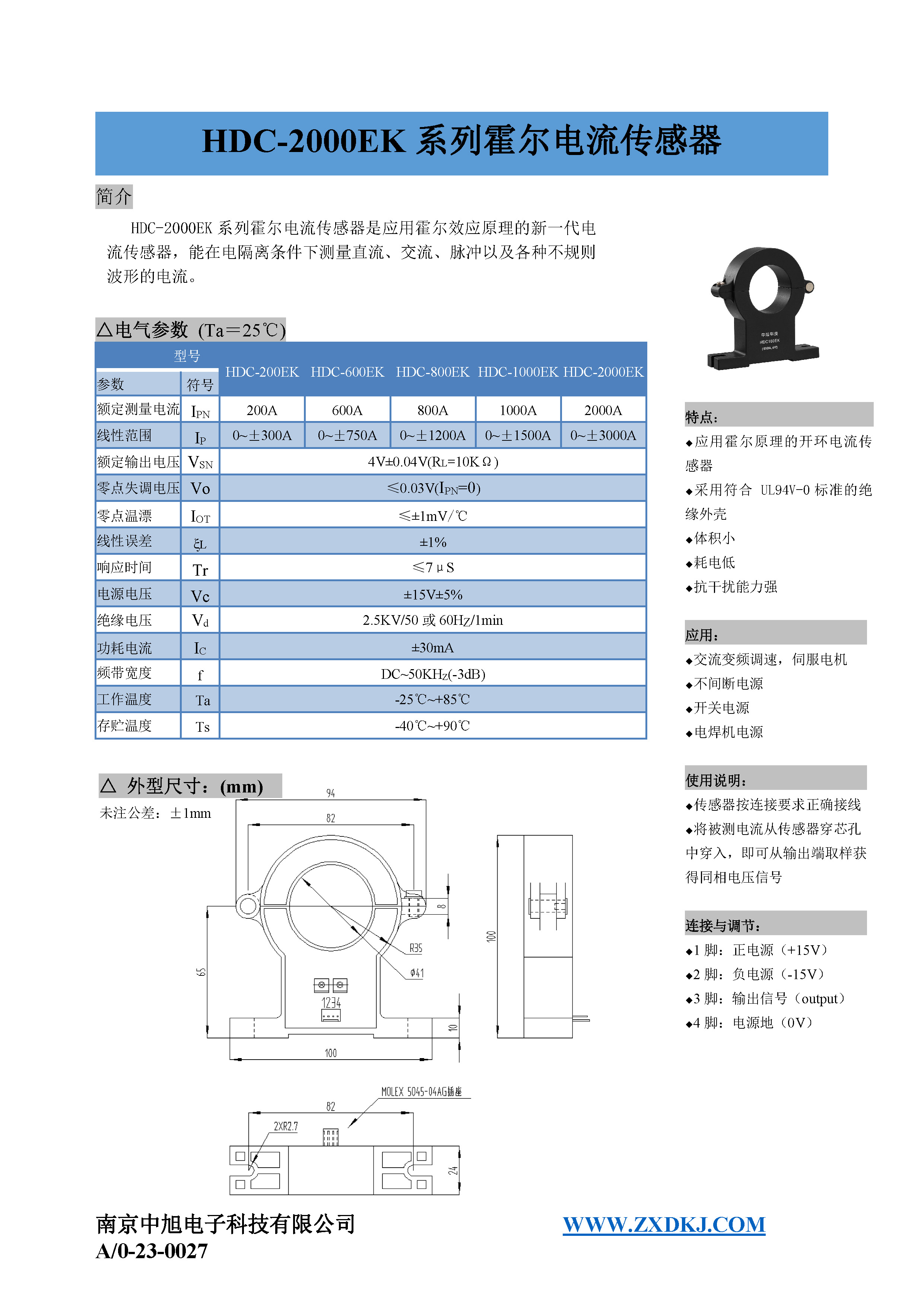 HDC-1000EK series Hall current sensor is a new generation of current sensor using the principle of Hall effect. It can measure currents of DC, AC, pulse and various irregular waveform under electrical isolation.