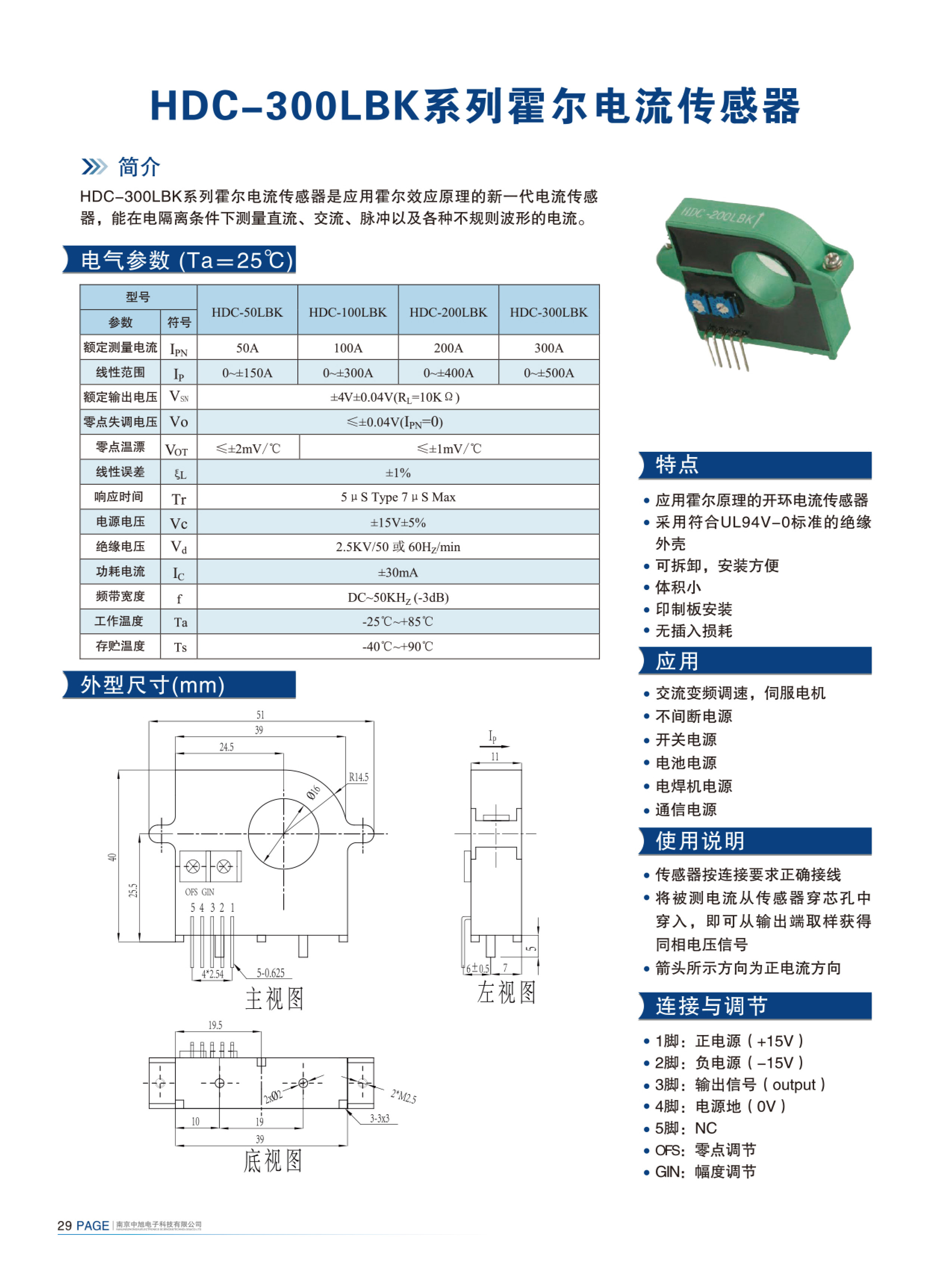 HDC-300LBK series Hall current sensor is a new generation of current sensor using the principle of Hall effect. It can measure currents of DC, AC, pulse and various irregular waveform under electrical isolation.