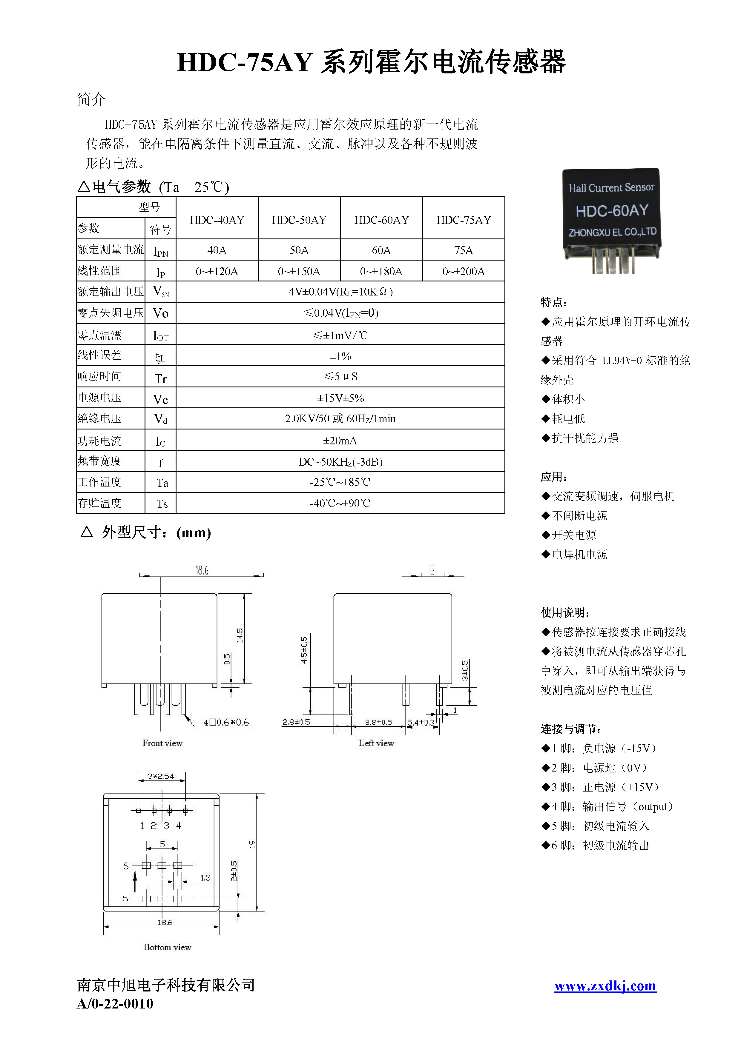 HDC-60AY series Hall current sensor is a new generation of current sensor using the principle of Hall effect. It can measure currents of DC, AC, pulse and various irregular waveform under electrical isolation.
